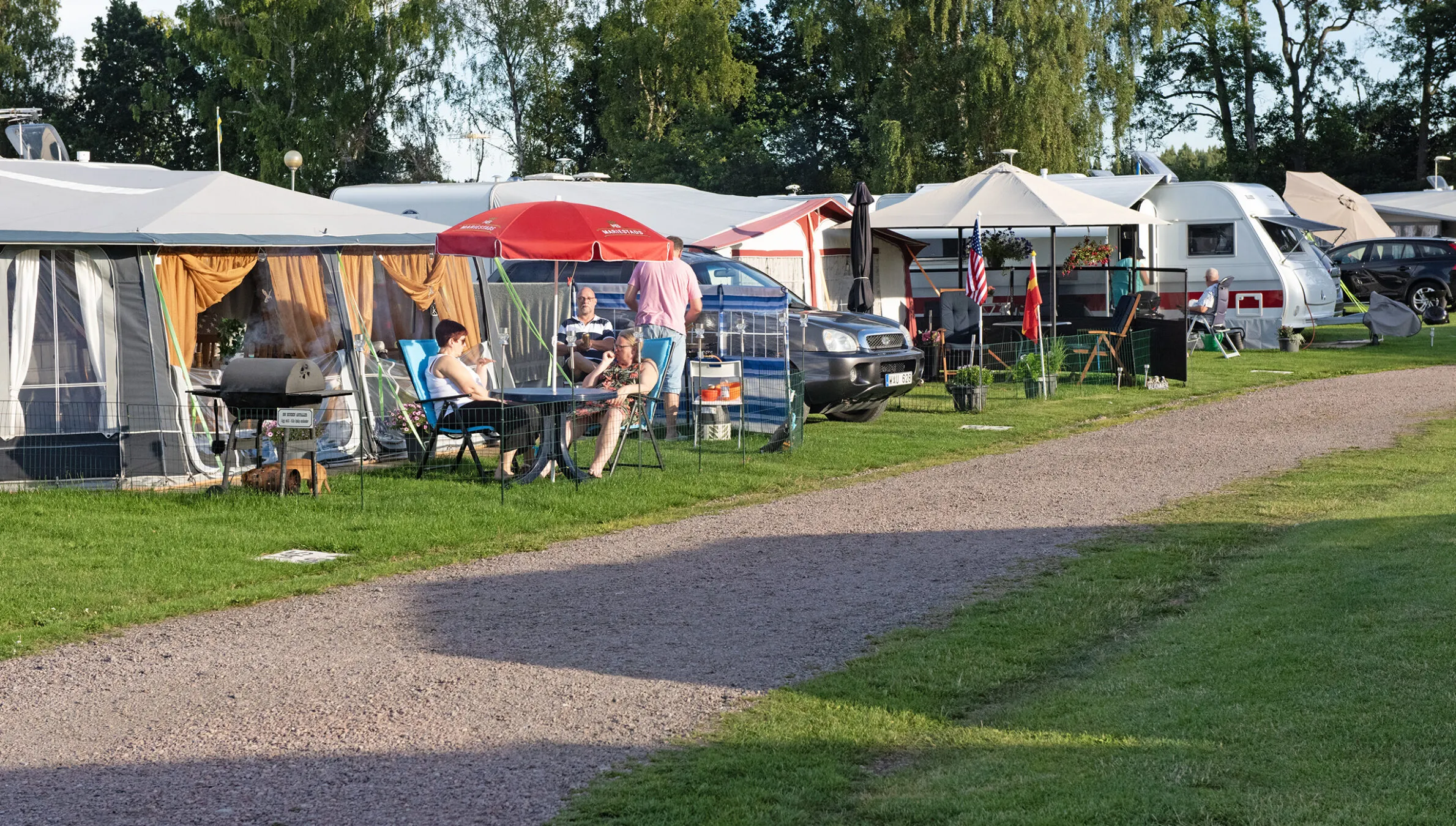 Vi erbjuder inte platsbokning. Det innebär att du ofta kan förlänga din vistelse. Vänligen ange dina önskemål vid bokningen, t.ex. nära servicehuset. Vi försöker uppfylla dina önskemål.