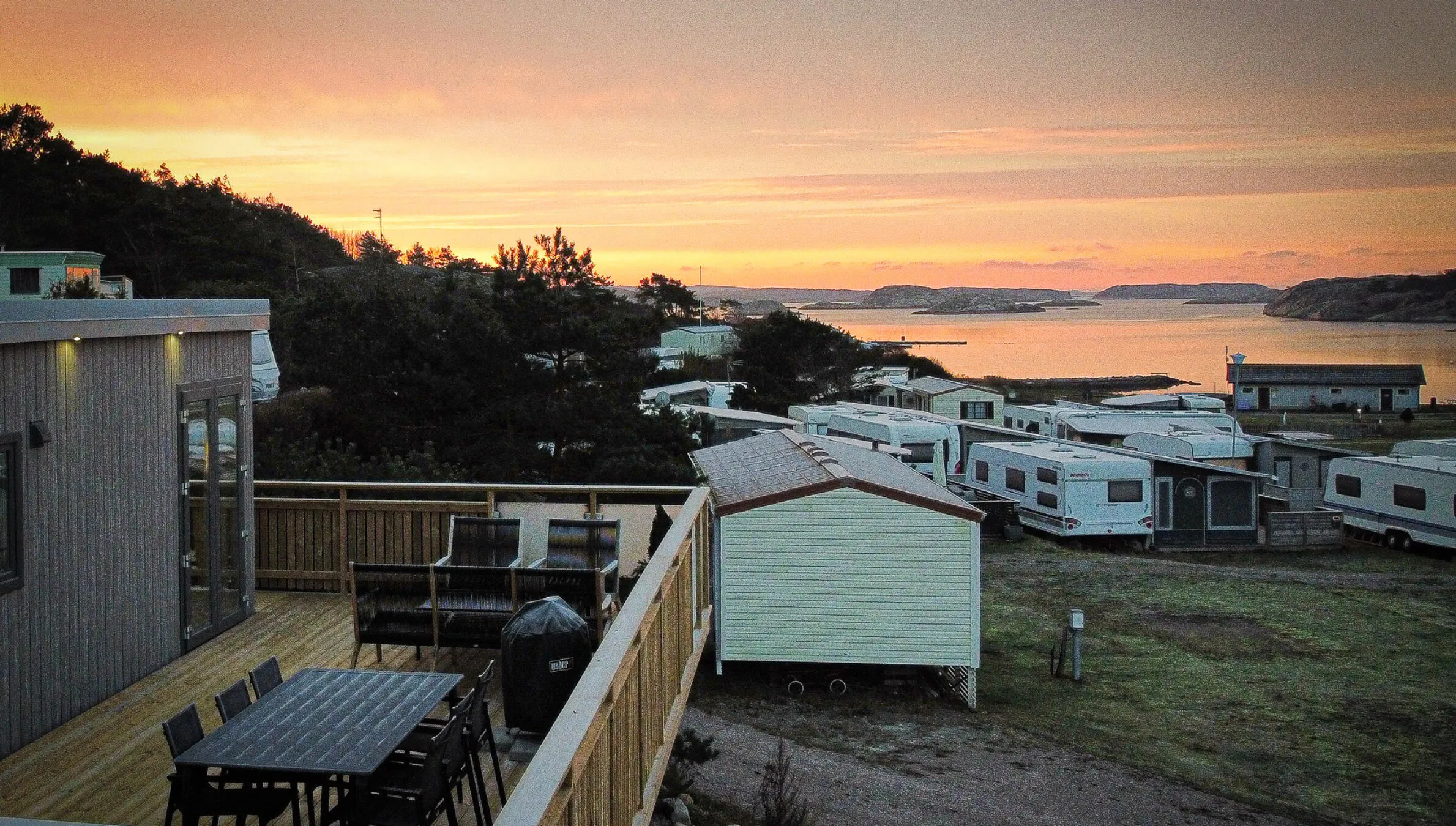 I vårt hummerpaket bor ni bekvämt i en av campingplatsens fullt utrustade stugor med egen terrass.